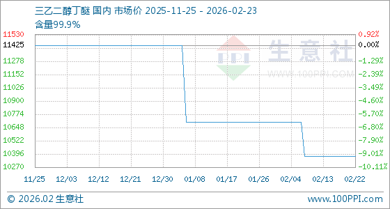 2月23日,生意社三乙二醇丁醚基准价为10375.00元/吨,与本月初(10700.00元/吨)相比,下降了3.04%。