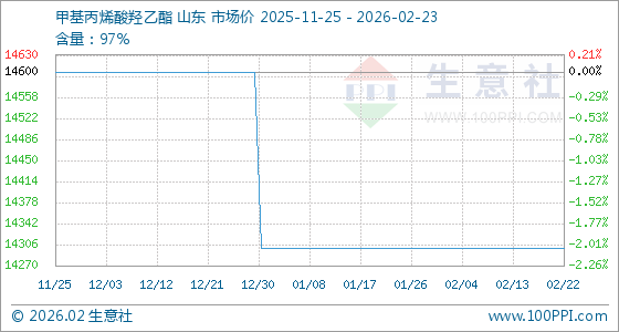 2月23日,生意社甲基丙烯酸羟乙酯基准价为14300.00元/吨,与本月初持平。