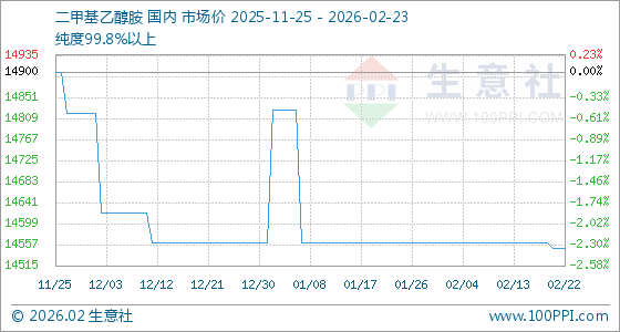 2月23日,生意社二甲基乙醇胺基准价为14550.00元/吨,与本月初(14560.00元/吨)相比,下降了0.07%。