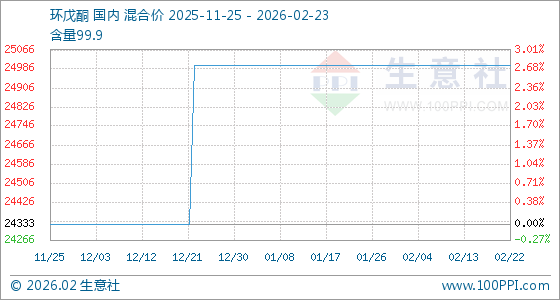 2月23日,生意社环戊酮基准价为25000.00元/吨,与本月初持平。