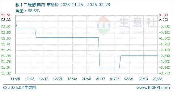 2月23日,生意社叔十二硫醇基准价为52.00元/千克,与本月初持平。