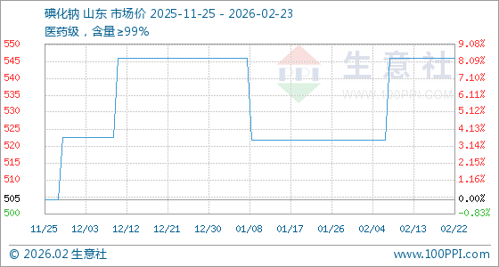 2月23日,生意社碘化钠基准价为546.67元/千克,与本月初(522.50元/千克)相比,上涨了4.63%。