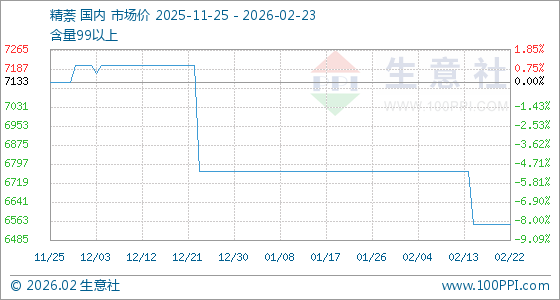 2月23日,生意社精萘基准价为6550.00元/吨,与本月初(6766.67元/吨)相比,下降了3.2%。