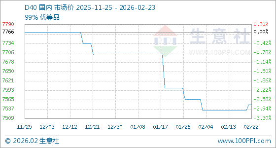 2月23日,生意社D40基准价为7550.00元/吨,与本月初(7566.67元/吨)相比,下降了0.22%。