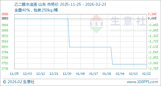 2月23日,生意社乙二醛水溶液基准价为3750.00元/吨,与本月初持平。