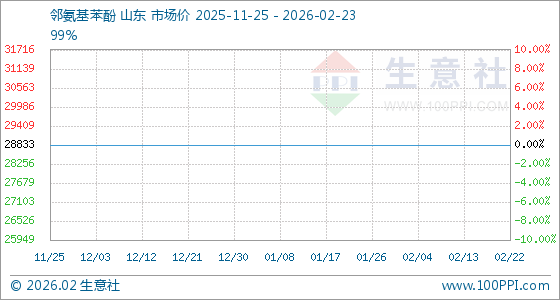 2月23日,生意社邻氨基苯酚基准价为28833.33元/吨,与本月初持平。