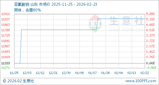 2月23日,生意社亚氯酸钠基准价为11950.00元/吨,与本月初持平。