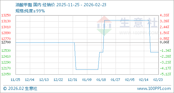 2月23日,生意社油酸甲酯基准价为12500.00元/吨,与本月初(13150.00元/吨)相比,下降了4.94%。