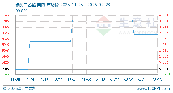 2月23日,生意社碳酸二乙酯基准价为8616.67元/吨,与本月初(8712.50元/吨)相比,下降了1.1%。