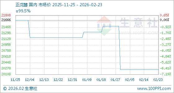 2月23日,生意社正戊醇基准价为20250.00元/吨,与本月初持平。