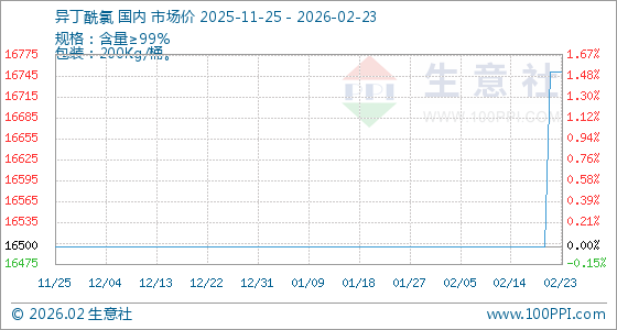 2月23日,生意社异丁酰氯基准价为16750.00元/吨,与本月初(16500.00元/吨)相比,上涨了1.52%。