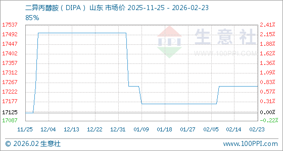 2月23日,生意社二异丙醇胺(DIPA)基准价为17250.00元/吨,与本月初(17166.67元/吨)相比,上涨了0.49%。