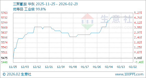 2月23日,生意社三聚氰胺基准价为5737.50元/吨,与本月初(5675.00元/吨)相比,上涨了1.10%。