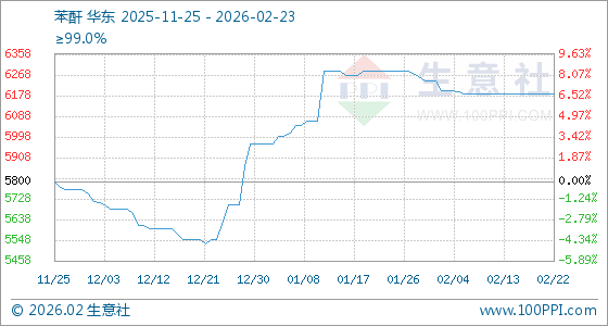2月23日,生意社苯酐基准价为6183.33元/吨,与本月初(6243.33元/吨)相比,下降了0.96%。