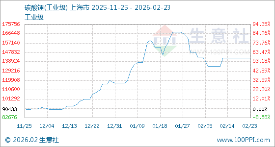 2月23日,生意社碳酸锂(工业级)基准价为142000.00元/吨,与本月初(148000.00元/吨)相比,下降了4.05%。