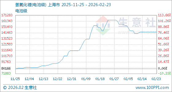 2月23日,生意社氢氧化锂(电池级)基准价为143000.00元/吨,与本月初(156000.00元/吨)相比,下降了8.33%。