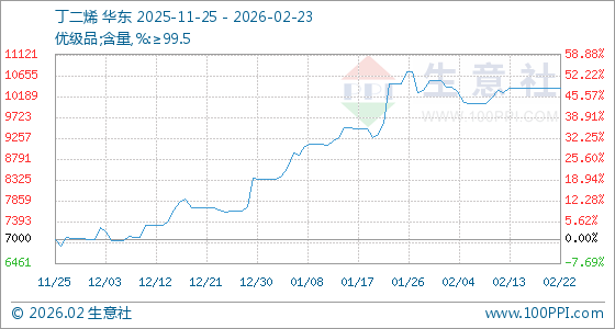 2月23日,生意社丁二烯基准价为10366.67元/吨,与本月初(10533.33元/吨)相比,下降了1.58%。