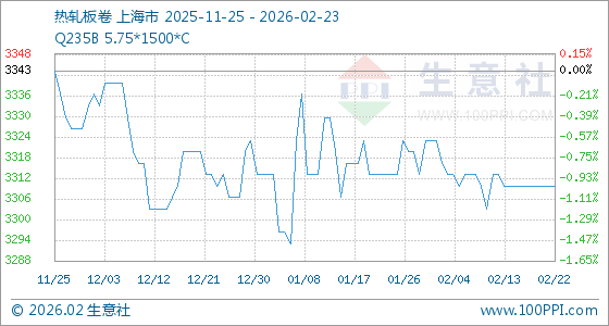 2月23日,生意社热轧板卷基准价为3310.00元/吨,与本月初(3323.33元/吨)相比,下降了0.4%。