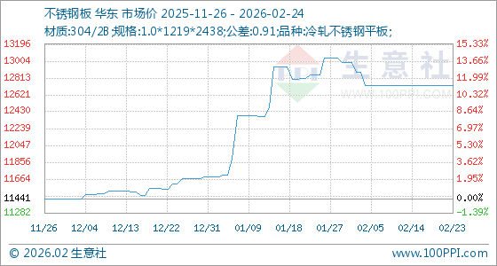 2月24日,生意社不锈钢板基准价为12725.00元/吨,与本月初(12991.67元/吨)相比,下降了2.05%。
