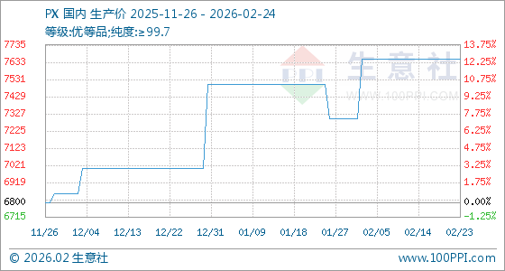 2月24日,生意社PX基准价为7650.00元/吨,与本月初(7300.00元/吨)相比,上涨了4.79%。