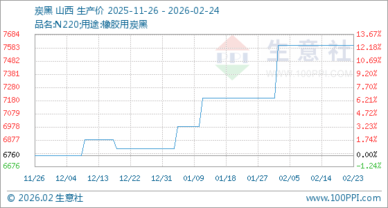 2月24日,生意社炭黑基准价为7600.00元/吨,与本月初(7200.00元/吨)相比,上涨了5.56%。