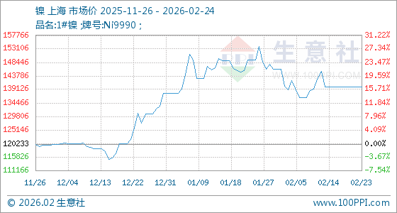2月24日,生意社镍基准价为140100.00元/吨,与本月初(146016.67元/吨)相比,下降了4.05%。
