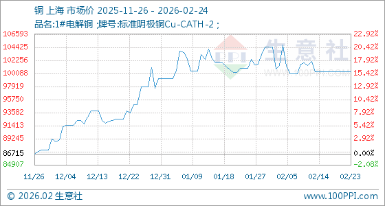 2月24日,生意社铜基准价为100356.67元/吨,与本月初(104496.67元/吨)相比,下降了3.96%。