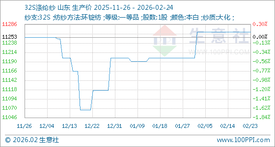 2月24日,生意社32S涤纶纱基准价为11266.67元/吨,与本月初(11200.00元/吨)相比,上涨了0.60%。