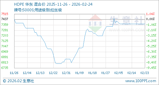 2月24日,生意社HDPE基准价为7375.00元/吨,与本月初(7337.50元/吨)相比,上涨了0.51%。