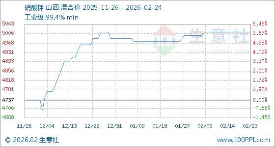 2月24日,生意社硝酸钾基准价为5012.50元/吨,与本月初(5000.00元/吨)相比,上涨了0.25%。
