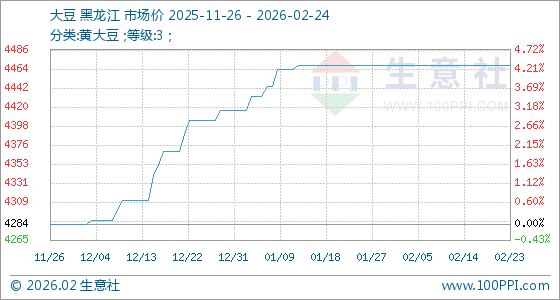 2月24日,生意社大豆基准价为4468.00元/吨,与本月初持平。