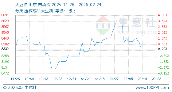 2月24日,生意社大豆油基准价为8354.00元/吨,与本月初(8640.00元/吨)相比,下降了3.31%。