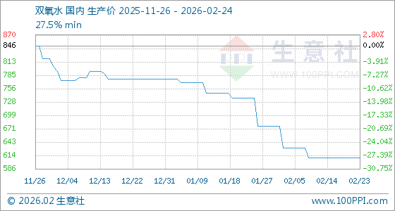 2月24日,生意社双氧水基准价为610.00元/吨,与本月初(676.67元/吨)相比,下降了9.85%。