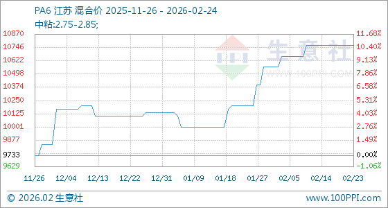 2月24日,生意社PA6基准价为10766.67元/吨,与本月初(10566.67元/吨)相比,上涨了1.89%。