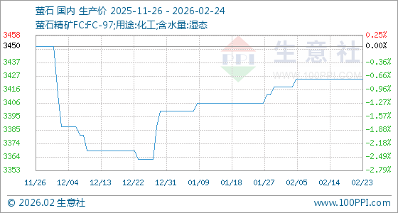 2月24日,生意社萤石基准价为3425.00元/吨,与本月初(3418.75元/吨)相比,上涨了0.18%。