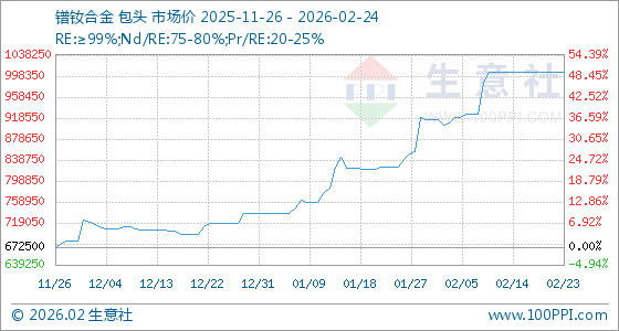 2月24日,生意社镨钕合金基准价为1005000.00元/吨,与本月初(915000.00元/吨)相比,上涨了9.84%。