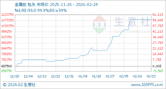 2月24日,生意社金属钕基准价为1085000.00元/吨,与本月初(947500.00元/吨)相比,上涨了14.51%。