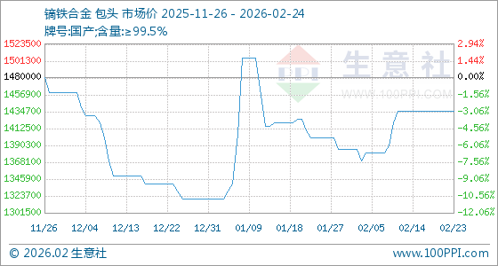 2月24日,生意社镝铁合金基准价为1435000.00元/吨,与本月初(1385000.00元/吨)相比,上涨了3.61%。