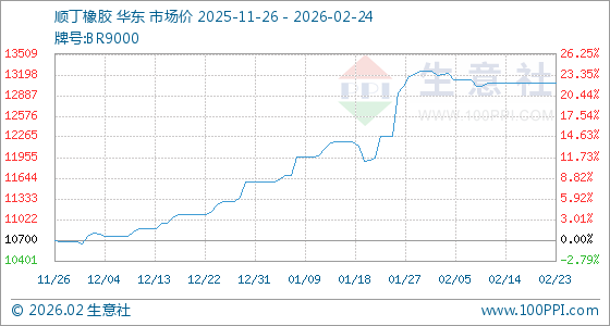 2月24日,生意社顺丁橡胶基准价为13070.00元/吨,与本月初(13250.00元/吨)相比,下降了1.36%。