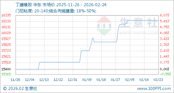 2月24日,生意社丁腈橡胶基准价为16250.00元/吨,与本月初(16175.00元/吨)相比,上涨了0.46%。