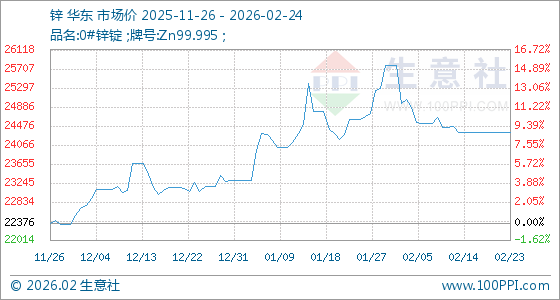 2月24日,生意社锌基准价为24330.00元/吨,与本月初(25776.00元/吨)相比,下降了5.61%。