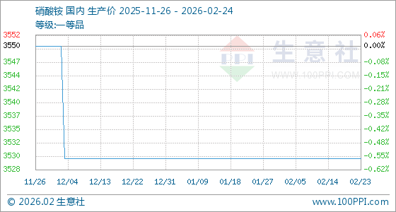 2月24日,生意社硝酸铵基准价为3530.00元/吨,与本月初持平。