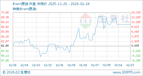 2月24日,生意社Brent原油基准价为67.52美元/桶,与本月初(69.59美元/桶)相比,下降了2.97%。