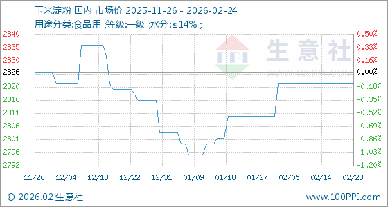 2月24日,生意社玉米淀粉基准价为2822.00元/吨,与本月初(2810.00元/吨)相比,上涨了0.43%。