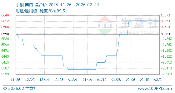2月24日,生意社丁酮基准价为6616.67元/吨,与本月初(6550.00元/吨)相比,上涨了1.02%。