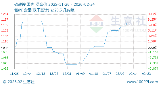 2月24日,生意社硫酸铵基准价为1190.00元/吨,与本月初(1153.33元/吨)相比,上涨了3.18%。