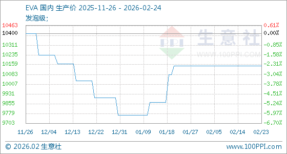 2月24日,生意社EVA基准价为10150.00元/吨,与本月初持平。