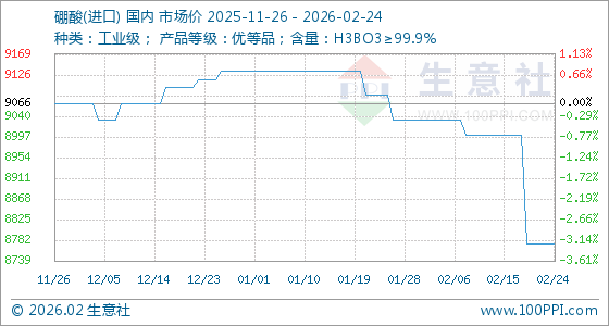 2月24日,生意社硼酸(进口)基准价为8775.00元/吨,与本月初(9033.33元/吨)相比,下降了2.86%。