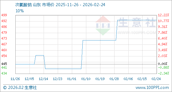 2月24日,生意社次氯酸钠基准价为494.00元/吨 ,与本月初持平。