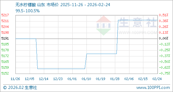 2月24日,生意社无水柠檬酸基准价为5212.50元/吨,与本月初持平。